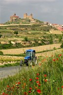 Blue tractor on rural road, San Vicente de la Sonsierra Village, La Rioja, Spain
