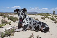 A Great Dane lying in the sand in Ventura, California