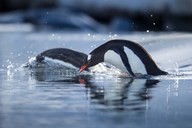 Antarctica, Anvers Island, Gentoo Penguins diving into water.