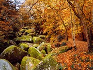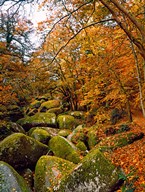 Autumn Trees with Granite Rocks, Huelgoat forest, Finistere, Brittany, France