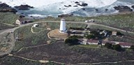 Aerial view of Piedras Blancas Lighthouse on the coast, San Luis Obispo County, California, USA