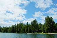 Trees along bank of Lake Almanor, California, USA