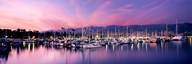 Boats moored in harbor at sunset, Santa Barbara Harbor, California
