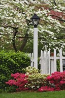 Pickett Fence, Lamp, Azaleas, And Flowering Dogwood Tree, Louisville, Kentucky