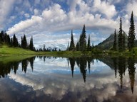 Mt Rainier And Clouds Reflecting In Upper Tipsoo Lake