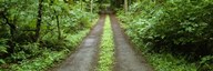 Lush foliage lining a wet driveway, Bainbridge Island, Washington, USA