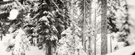 Snow covered evergreen trees at Stevens Pass, Washington State (black and white)