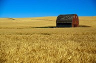 Red barn in wheat field, Palouse region, Washington, USA.
