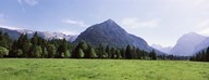 Trees on a hill with mountain range in the background, Karwendel Mountains, Risstal Valley, Hinterriss, Tyrol, Austria