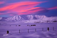 Sunset over Hawkdun Range and farmland, Maniototo, Otago, New Zealand