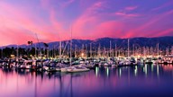 Boats moored in harbor at sunset, Santa Barbara Harbor, Santa Barbara County, California, USA