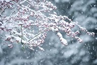 Snow covered branch during snowing, Washington State, USA