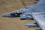 Front section of a Royal Air Force Harrier GR9 flying low over North Wales