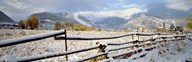 Wooden fence covered with snow at the countryside, Colorado, USA