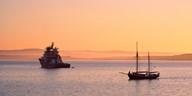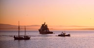 Tugboat and a tall ship in the Baie de Douarnenez at sunrise, Finistere, Brittany, France