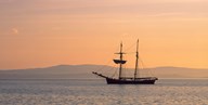 Tall ship in the Baie De Douarnenez at sunrise, Finistere, Brittany, France