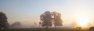 Cattle grazing in field at misty sunrise, USK Valley, South Wales