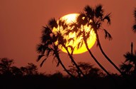 Sunrise behind silhouetted trees, Kenya, Africa