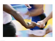 Mid section view of runners exchanging baton at a relay race