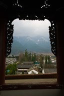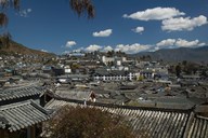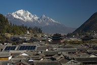 High angle view of houses and Jade Dragon Snow Mountain viewed from Mu Family Mansion, Old Town, Lijiang, Yunnan Province, China