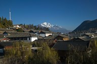 High angle view of buildings in the new town towards Jade Dragon Snow Mountain, Lijiang, Yunnan Province, China