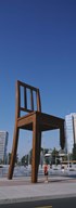 Woman standing under a sculpture of large broken chair, Geneva, Switzerland