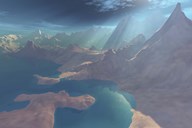 Clouds break over a desert on Matsya, giving a glimpse of the planet Samandar
