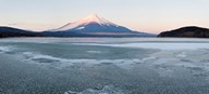 Yamanaka Lake covered with ice and Mt Fuji in the background, Yamanakako, Yamanashi Prefecture, Japan