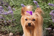 Purebred Yorkshire Terrier dog, purple bow