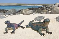 Two Marine iguanas (Amblyrhynchus cristatus) on sand, Galapagos Islands, Ecuador