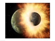 Concept of our moon slamming at great speed into a body the size of Mercury