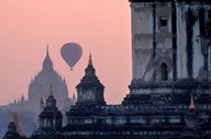 Hot Air balloon over the temple complex of Pagan at dawn, Burma