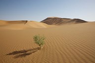 China, Gansu Province. Lone plant casts shadow on Badain Jaran Desert.
