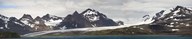 Bay in front of snow covered mountains, Grace Glacier, Salisbury Plain, Bay of Isles, South Georgia Island