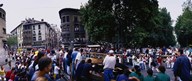 Crowd at Festival of San Fermin, running of the bulls, Pamplona, Navarre, Spain