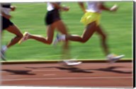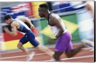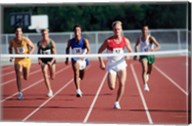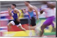 Low section view of male athletes running on a running track