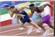 Side profile of two young men passing a relay baton