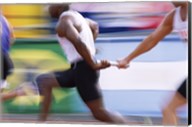 Side profile of runners passing a baton in a relay race