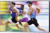 Side profile of three men running low on a running track