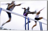 Side profile of three people jumping a hurdle
