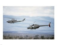A left side view of an AH-1 Cobra helicopter, front, and an OH-58 Kiowa helicopter