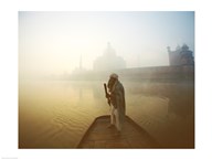 Silhouette of a man standing on a boat in the Yamuna River, Taj Mahal, Agra, Uttar Pradesh, India