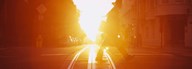 Side profile of a person crossing the cable car tracks at sunset, San Francisco, California, USA