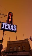 Low angle view of a neon sign of a hotel lit up at dusk, Fort Worth Stockyards, Fort Worth, Texas, USA