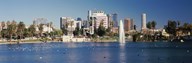 Fountain in front of buildings, Macarthur Park, Westlake, City of Los Angeles, California, USA 2010