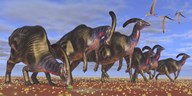 A herd of Parasaurolophus dinosaurs searching for vegetation