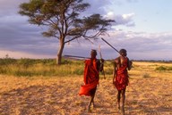 Two Maasai Morans Walking with Spears at Sunset, Amboseli National Park, Kenya
