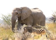 African Elephant and Zebra at Namutoni Resort, Namibia