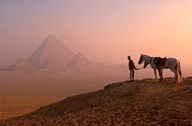 Dawn View of Guide and Horses at the Giza Pyramids, Cairo, Egypt