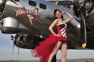 1940's style majorette pin-up girl on a B-17 bomber with an American flag